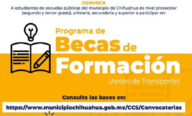 Ciudad de Chihuahua..- Como parte de las acciones para evitar la deserción escolar por falta de recursos económicos, la Dirección de Desarrollo Humano y Educación, da a conocer la convocatoria para formar parte del programa de Becas de Formación 2023, antes llamadas Becas de Transporte.