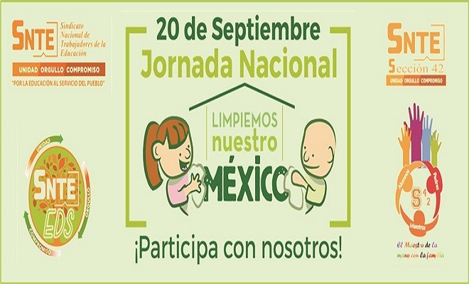 El próximo domingo 20 de septiembre se llevará a cabo en todo el país la campaña “Limpiemos Nuestro México”, en el marco del programa “SNTE Educación para el desarrollo sostenible” impulsado por Juan Díaz de la Torre, en alianza con Fundación Azteca la cual involucra a Padres de Familia, Alumnos y Trabajadores de la Educación en una jornada en la que desarrollarán tareas de recolección y separación de basura en el entorno escolar, así lo dio a conocer René Frías, Secretario General de la Sección 42.