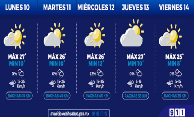 Chihuahua,.- La Coordinación Municipal de Protección Civil, informa a la población que, para la semana del 10 al 14 de abril, se pronostican temperaturas cálidas durante las tardes y clima fresco por las mañanas y noches.