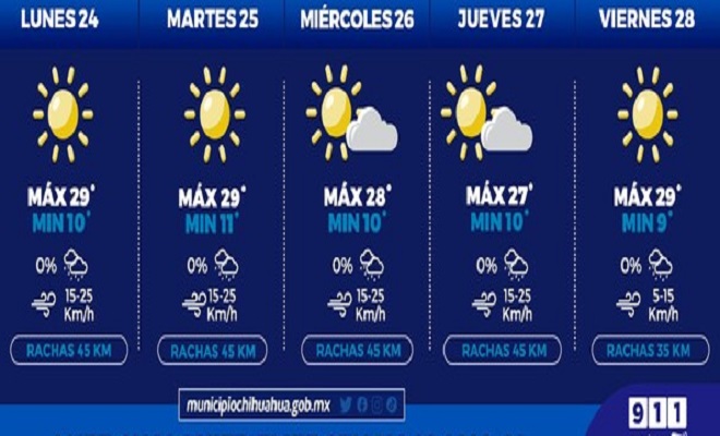 Ciudad de Chihuahua.- La Coordinación Municipal de Protección Civil, informa a la población que, para la semana del 24 al 28 de abril, se pronostican temperaturas máximas de 29°C, así como mañanas y noches frescas con mínimas de hasta 9°C.