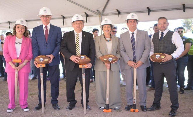 Chihuahua.- Resaltar el deporte y reconocer los logros en el Fútbol Americano Universitario, son de los objetivos que el rector Luis Alfonso Rivera Campos destacó al inicio de los trabajos para el mejoramiento y acondicionamiento del Nido de Águilas en el Campus I de la UACH.