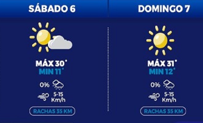 | Ciudad de Chihuahua.- La Coordinación Municipal de Protección Civil, informa que este fin de semana, se prevén temperaturas máximas de 31°C y mínimas de 11°C, por lo que invita a la ciudadanía a seguir las recomendaciones que emiten por calor. Para el sábado, se pronostican 30°C como máxima, y una mínima de 11°C con rachas de hasta 35 kilómetros por hora; mientras que el domingo se espera una máxima de 31°C y una mínima de 12°C, por lo cual se prevé un fin de semana caluroso. – Evita exponerte al sol por periodos prolongados. – Mantente hidratado. – Evita realizar actividades al aire libre cuando los rayos del sol están en su punto máximo. – Resguarda a tus mascotas de los rayos del sol. Asimismo, se exhorta a la ciudadanía a comunicarse a la línea 9-1-1 o a la aplicación “Marca el Cambio”, en caso de alguna emergencia. |