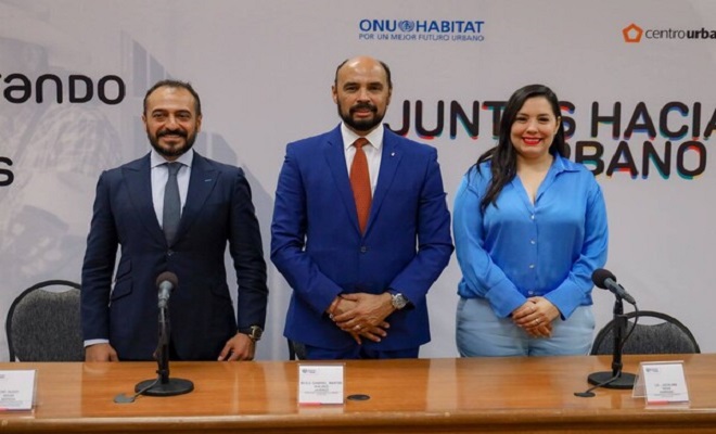 En su intervención, el secretario de Desarrollo Urbano y Ecología, Gabriel Valdez, expuso el trabajo conjunto con la Secretaría de Relaciones Exteriores del Gobierno Federal y el Municipio para trabajar temas de desarrollo urbano sostenible en alianza con ONU Hábitat y otras instituciones.