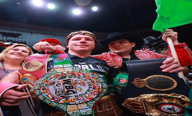 Frente a su público, el ‘Canelo’ puso en juego sus cuatro cinturones de la categoría supermediano: del Consejo Mundial de Boxeo (CMB), la Organización Mundial de Boxeo (OMB), la Asociación Mundial de Boxeo (AMB) y la Federación Internacional de Boxeo (FIB).