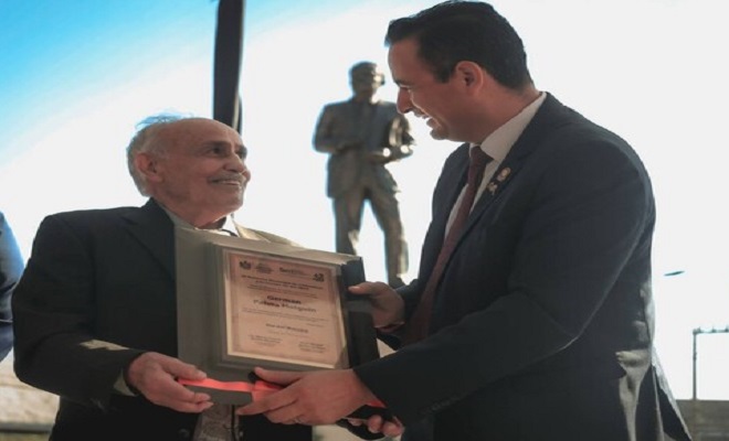 Ciudad de Chihuahua.- En conmemoración del Día del Maestro, el alcalde de Chihuahua, Marco Bonilla, encabezó, en la explanada de El Palomar, los honores a la bandera y la develación de una placa en honor a Germán Palma Holguín como Maestro Ilustre edición 2023.
