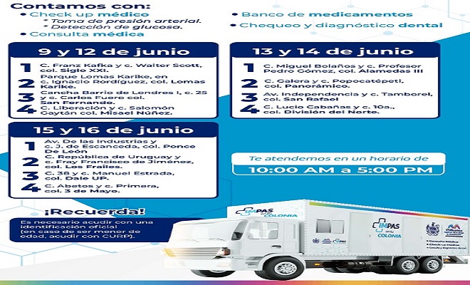 Podrás encontrar los consultorios móviles de las 10:00 a 17:00 horas, en las siguientes colonias: