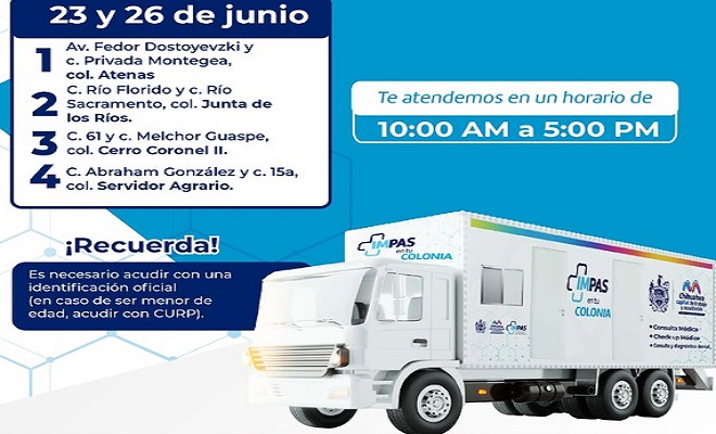 Ciudad de Chihuahua.- El Instituto Municipal de Prevención y Atención a la Salud (IMPAS), invita a las familias de la Capital a aprovechar los servicios gratuitos en los Consultorios Móviles del programa “IMPAS en Tu Colonia”, en respuesta a las instrucciones del alcalde Marco Bonilla, de atender en materia de salud a los habitantes de la ciudad.