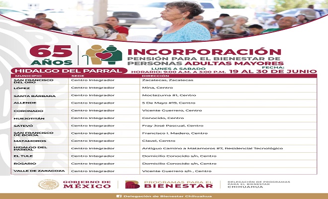 Chihuahua.- La delegación estatal de la Secretaría de Bienestar y las direcciones regionales trabajan desde el 19 y hasta el 30 de junio en la incorporación de personas adultas mayores que cumplieron 65 años de edad durante los meses de mayo y junio de este año.