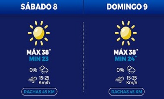 Para el día sábado, se pronostica la elevación de la temperatura a 38°C, y una mínima de 23°C con rachas de hasta 45 kilómetros por hora. Finalmente, el domingo está estimada una máxima de 38°C y una mínima de 24°C, con un cielo soleado.