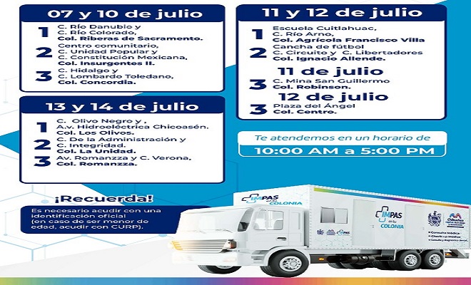 Podrás encontrar los consultorios móviles de las 10:00 a 17:00 horas, en las siguientes colonias: