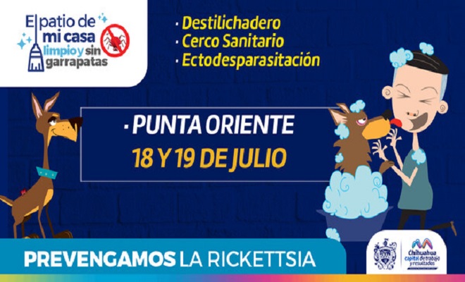 Ciudad de Chihuahua.- El Instituto Municipal de Prevención y Atención a la Salud (IMPAS), trabajará en conjunto con el Municipio de Aquiles Serdán para realizar acciones que prevengan infecciones por mordedura de garrapata, con el programa “El Patio de Mi Casa” este 18 y 19 de julio en la colonia Punta Oriente, de 9:30 a 14:00 horas.