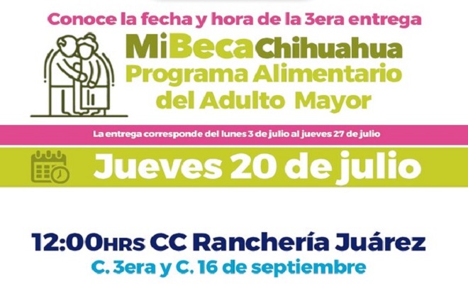 Este jueves, 20 de julio, beneficiarios del Programa Alimentario del Adulto Mayor (PAAM) podrán acudir por su apoyo alimentario al centro comunitario Ranchería Juárez, a partir de las 12:00 horas.