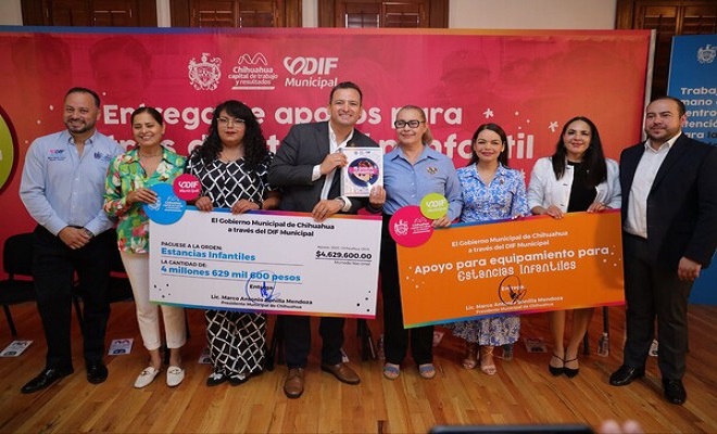 Ciudad de Chihuahua.- En respuesta al compromiso del Municipio de cuidar y proteger a las familias chihuahuenses, el alcalde Marco Bonilla y la presidenta del DIF Karina Olivas, hicieron entrega de apoyos económicos para que estancias infantiles y Centros de Bienestar Infantil, continúen recibiendo a las hijas e hijos de madres y padres trabajadores que diariamente salen de sus hogares para mejorar su calidad de vida.