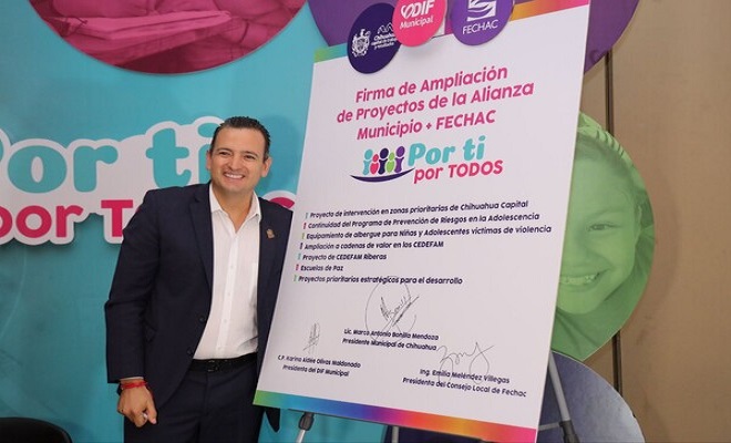 Ciudad de Chihuahua.- El alcalde Marco Bonilla, encabezó la firma de ampliación de la alianza «Por ti, Por Todos» con la Fundación del Empresariado Chihuahuense (FECHAC), para continuar con labores conjuntas e invertir en obras y acciones en beneficio del desarrollo integral de las familias de la Capital.