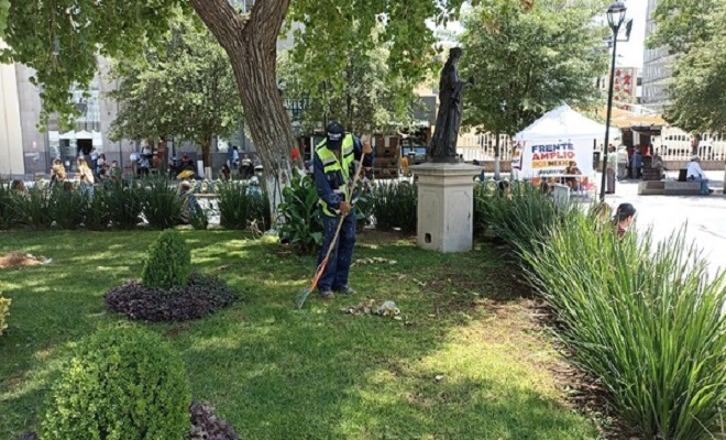 Ciudad de Chihuahua.- Diariamente personal de Mantenimiento Urbano de manera manual da limpieza a 2 mil 500 metros cuadrados de mármol, 56 alcorques (es la base de las fosas en los árboles) y 181 bancas; además, se sopletean más de 12 mil metros. De igual manera se realiza el riego diario de los espacios verdes y corte del césped y arbustos.
