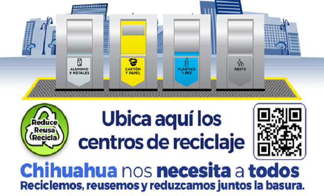 Ciudad de Chihuahua.- La Dirección de Servicios Públicos Municipales, pone a disposición de la ciudadanía 14 estaciones de reciclaje en las cuales podrás separar los residuos de tu hogar en cuatro contenedores para plástico y pet, cartón y papel, aluminio y metales, y uno más para el resto de los desperdicios que no sean orgánicos.