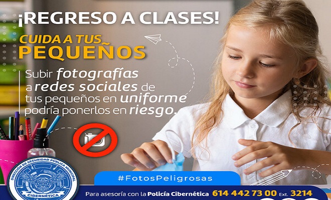 Ciudad de Chihuahua.- Ante el regreso a clases de miles de estudiantes tanto en la ciudad como en la zona rural, la Policía Cibernética, exhorta a padres de familia a evitar publicar fotografías con datos de las instituciones educativas, uniformes con logos o nombres que los identifiquen y que puedan ser motivo de acecho por parte de personas mal intencionadas que navegan en internet.