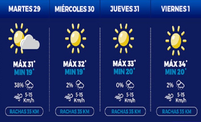 El jueves, se pronostica una máxima de 33°C y una mínima de 20°C, finalmente el viernes se espera una temperatura máxima de 34°C y una mínima de 20°C, con mínimas probabilidades de lluvia para la tarde.
