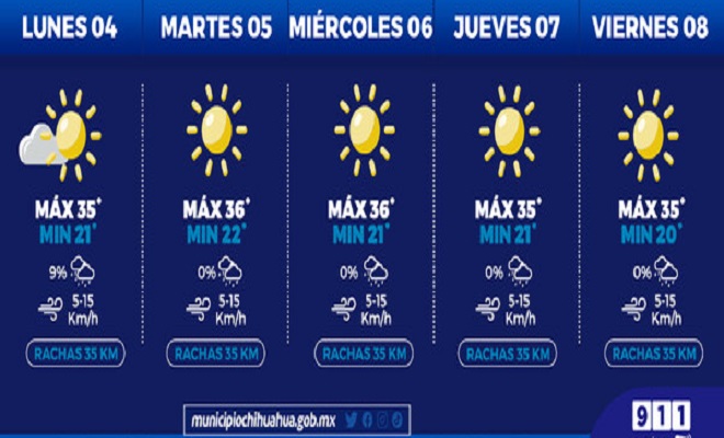 Ciudad de Chihuahua.- La Coordinación de Protección Civil Municipal, informa que, para esta semana, regresan las altas temperaturas, ya que se registran máximas de hasta 36°C con una probabilidad mínima de lluvias para este lunes.