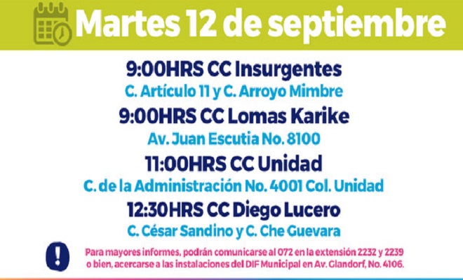 Para mayores informes, podrán comunicarse al 072 en las extensiones 2232 y 2239 o bien, acercarse a las instalaciones del DIF Municipal en avenida Glandorf, número 4106, frente al Club de Leones, de lunes a viernes en un horario de 9:00 am a 3:30 pm.