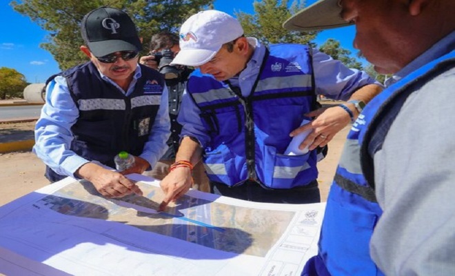 Ciudad de Chihuahua.- El alcalde Marco Bonilla Mendoza acompañado del director de Obras Públicas del Municipio, Rodolfo Armendáriz, realizó un recorrido para supervisar los avances de la construcción de la segunda etapa del Polideportivo Luis H. Álvarez y el dren pluvial que dará servicio a este lugar y a todas las familias de la colonia Quintas Carolinas que sufrían cada temporada de lluvias.