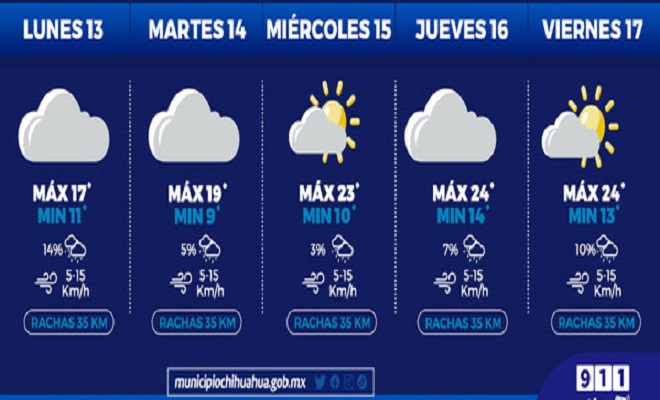 Ciudad de Chihuahua.- La Coordinación de Protección Civil Municipal, informa que para esta semana la masa de aire que impulsa al frente frío número 9 favorecerá ambiente templado por la tarde y temperaturas frías por la mañana y noche, además de cielo mayormente nublado con mínima probabilidad de lluvia.