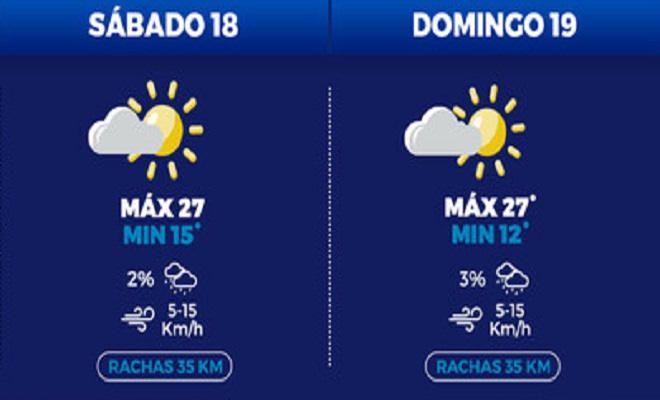 Ciudad de Chihuahua.- La Coordinación Municipal de Protección Civil, informa que este fin de semana, del 17 al 19 de noviembre, se prevén temperaturas máximas de 27°C y mínimas de hasta 12°C, con baja probabilidad de lluvias.