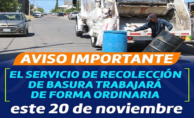 Ciudad de Chihuahua.- La Dirección de Servicios Públicos, informa a la población en general que el servicio de recolección de basura funcionará de forma regular el próximo lunes 20 de noviembre.
