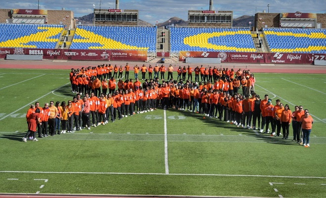 Chihuahua.- Dentro de las acciones que se llevan a cabo para fomentar la erradicación de la violencia contra la mujer; estudiantes, representativos de los conjuntos deportivos, autoridades tales como directores de facultades, docentes, administrativos, alumnos y personal de mantenimiento, se dieron cita en el Estadio Deportivo Universitario para juntos formar un moño naranja.