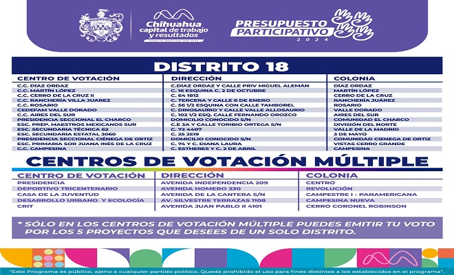 Una de estas vertientes es el Presupuesto Participativo pues mediante el voto se pueden elegir los proyectos a realizar en las diversas colonias, y son obras que requieren esos sectores. La invitación es a mayores de 18 años que pueden emitir su voto por 5 proyectos, presentando su credencial de elector, y niños mayores de 6 años llevando su CURP.