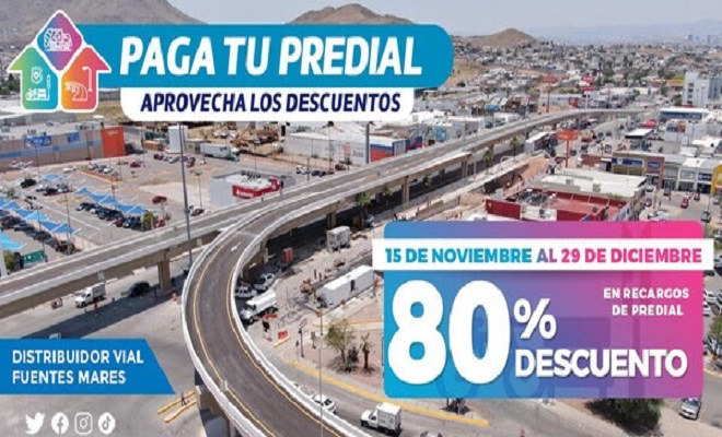 Chihuahua.- La Tesorería municipal, recuerda a la ciudadanía que tienen hasta el 29 de diciembre para aprovechar el descuento del 80 por ciento en los recargos del Impuesto Predial, el cual aplica a personas físicas y morales.