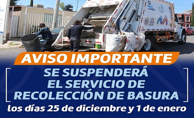 Ciudad de Chihuahua.- Con motivo de la celebración de las fiestas decembrinas, la Dirección de Servicios Públicos Municipales, informa a la ciudadanía en general que los días 25 de diciembre y 1 de enero, se suspenderá el servicio de recolección de basura.