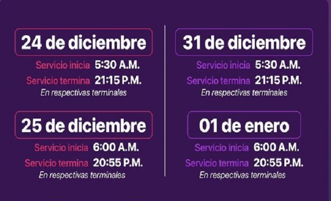 Para el 24 de diciembre, la primera salida será a las 05:30 am y la ultima salida llegará a las 21:15 pm en ambas terminales.