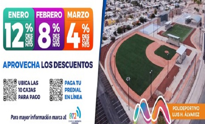 Ciudad de Chihuahua.- Da a conocer Tesorería municipal a la población, que a partir del 2 de enero del año entrante se tendrá un descuento del 12 por ciento en el Impuesto Predial.