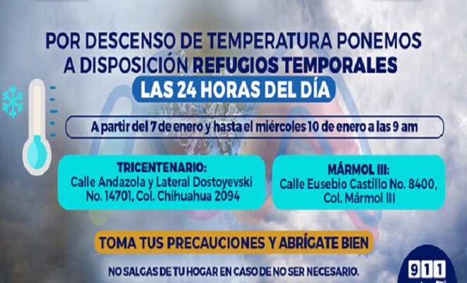 Los refugios temporales están ubicados en el centro comunitario Mármol III, en calle Eusebio Castillo número 8400 de la colonia Mármol lll en la zona sur; y en el centro comunitario Tricentenario, en calle lateral Dostoyevsky y calle Andazola numeral 14701 en colonia Chihuahua 2094 en la zona norte de la ciudad, donde se brinda alimentos y bebidas calientes a quienes acudan.