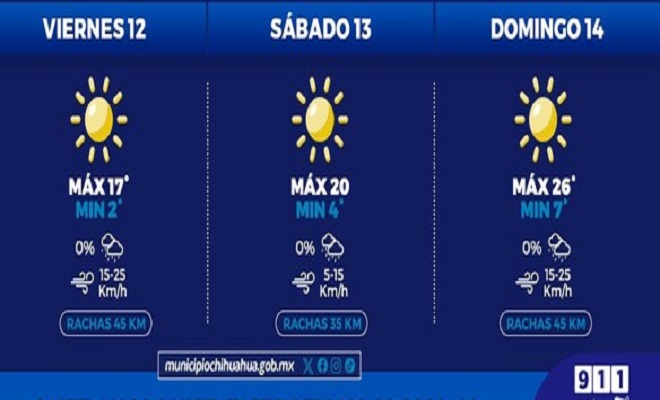 Ciudad de Chihuahua.- La Coordinación Municipal de Protección Civil, informa que este fin de semana, del 12 al 14 de enero, se prevén temperaturas máximas de 26°C y mínimas de 2°C, por lo cual, se exhorta a la población a atender las recomendaciones por frío que emiten las autoridades a fin de evitar complicaciones en la salud.