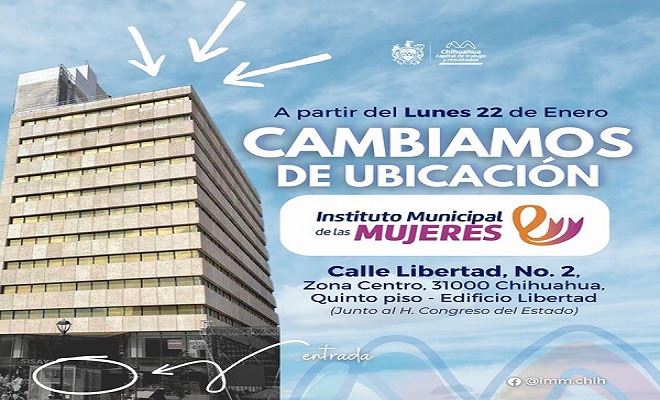 Ciudad de Chihuahua.- El Municipio, recuerda a todas las mujeres que viven en la Capital, que a partir de este lunes 22 de enero, las oficinas del Instituto Municipal de las Mujeres (IMM) cambia de ubicación, al quinto Piso del Edificio Libertad, en la calle Libertad número 2 de la Zona Centro, en contra esquina de la Presidencia Municipal.