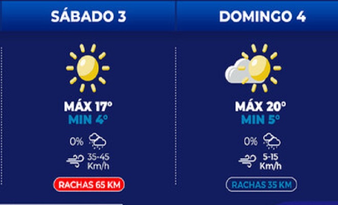 Para el sábado, se pronostica la elevación de la temperatura a 17°C, y una mínima de 4°C, con cielo soleado, con ráfagas de viento hasta 65 kilómetros por hora; mientras que, el domingo se espera una máxima de 20°C y una mínima de 5°C, con cielo mayormente soleado.
