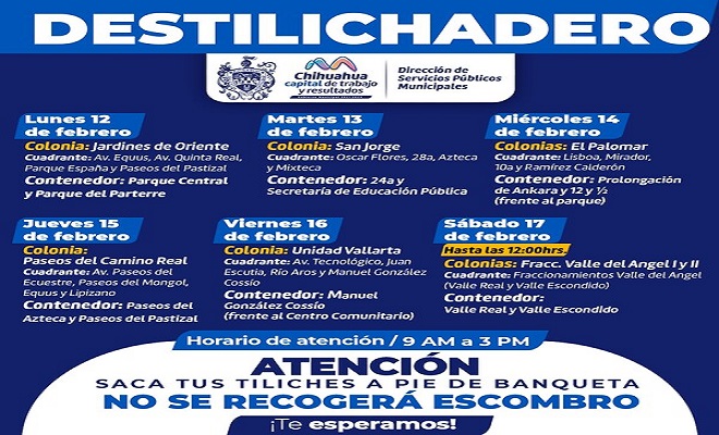 Ciudad de Chihuahua.- La Dirección de Servicios Públicos Municipales, dio a conocer a la ciudadanía el calendario del programa Destilichadero que se realizará del 12 al 17 de febrero en siete colonias de la capital.