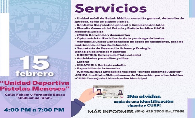 Ciudad de Chihuahua.- La Dirección de Cohesión Social y Participación Ciudadana, llevará este jueves 15 de febrero la feria de servicios “Juntos Cerca de Ti” a las instalaciones de la Unidad Deportiva José “Pistolas” Meneses, en el norte de la capital del estado.