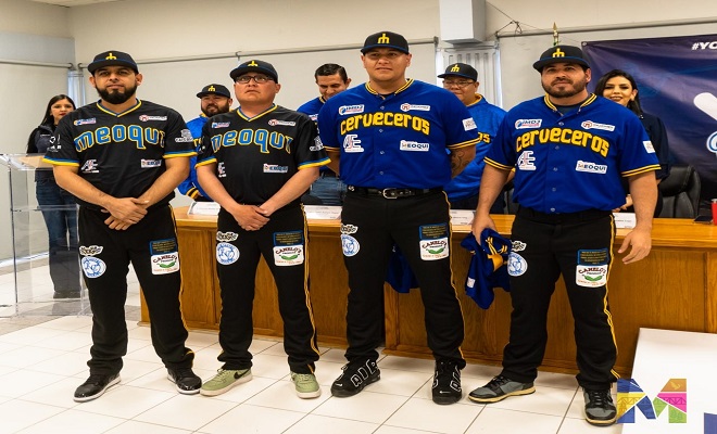 Meoqui, Chihuahua.- Al grito de ¡Vamos Cerveceros por el campeonato! La alcaldesa Miriam Soto realizó la presentación de la nueva indumentaria que portará el equipo de Beisbol de Meoqui en la temporada regional de la tercera zona, el cual, es en color azul marino, con el nombre en letras amarillas y los logos de los patrocinadores en el uniforme local, y color negro con detalles amarillos en el de visitante, ambos con pantaloncillos negros.
