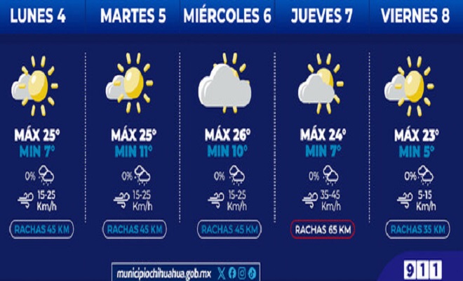 Ciudad de Chihuahua.- La Coordinación de Protección Civil Municipal informa que para esta semana se pronostican temperaturas máximas de 26°C, con mínimas de 5°C, además de cielos nublados y fuertes vientos para el jueves.