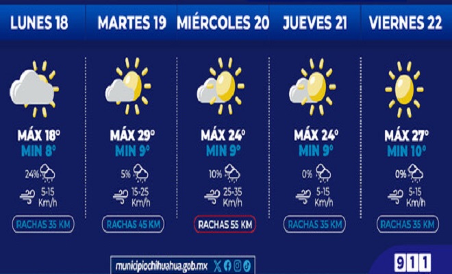 Para el martes, la máxima se espera que llegue a los 29°C, una mínima de 9°C, con un cielo parcialmente nublado, con rachas de viento de hasta 45 kilómetros por hora y mínima probabilidad de lluvia; mientras que, el miércoles se prevé que la mínima sea de 9°C y la máxima de 24°C, con un cielo mayormente soleado y con rachas de viento de hasta 55 kilómetros por hora, así como 10 por ciento de probabilidad de lluvia.