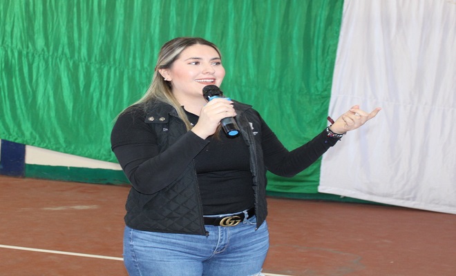 Durante su visita a la escuela primaria Eloy S. Vallina, la joven legisladora fue recibida por alumnos de todos los grados; reunidos en el gimnasio, brindaron un fuerte aplauso a la legisladora y al estudiante de sexto grado, Jesús Mauricio Aguilera Ortiz.