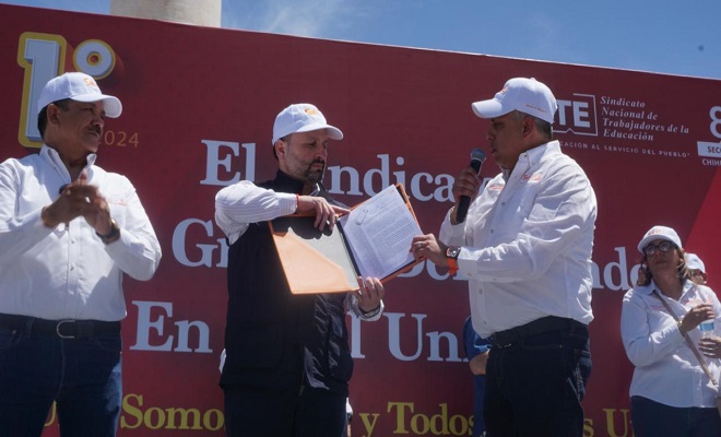 Durante su mensaje, el líder sindical, hizo entrega del Pliego Seccional de Demandas a Santiago de la Peña Grajeda, Secretario de Gobierno, quien acudió en representación de la María Eugenia Campos Galván, Gobernadora Constitucional del Estado de Chihuahua, mismo que se analizará por parte de la autoridad gubernamental para dar respuesta al magisterio federalizado.