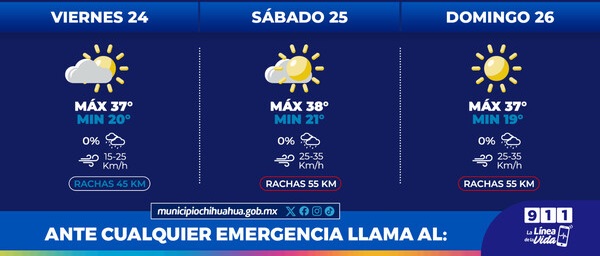 La Coordinación Municipal de Protección Civil, informa que este fin de semana, del 24 al 26 de mayo, se prevén temperaturas máximas de 38°C y mínimas de 19°C, así como ráfagas de viento de hasta 55 kilómetros por hora.