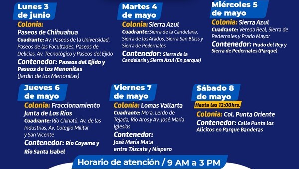 Ciudad de Chihuahua.- Para evitar acumulación de grandes dimensiones de basura en las viviendas, lo que podría generar plagas o problemas de salud, la Dirección de Servicios Públicos Municipales, informa el calendario del programa Destilichadero, que se realizará del 3 al 8 de junio en cinco colonias de la Capital.