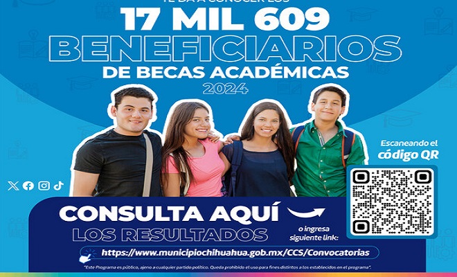 Ciudad de Chihuahua.- La Dirección de Desarrollo Humano y Educación, da a conocer la lista de folios de las personas beneficiarias en “Mi Beca Excelencia Académica” y “Mi Beca Chihuahua Formación”, edición 2024, la cual se encuentra disponible en la siguiente liga: www.municipiochihuahua.gob.mx/CCS/Convocatorias.