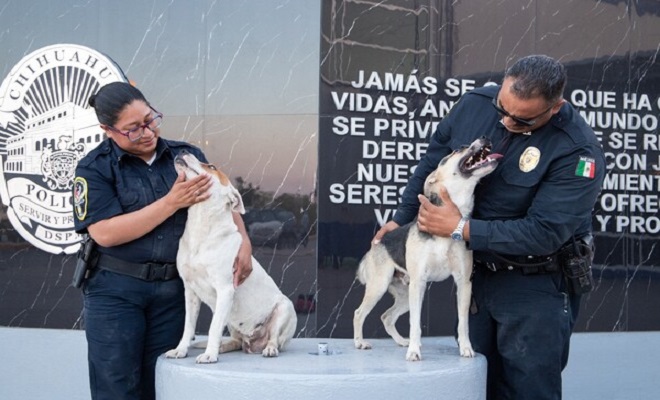 Ciudad de Chihuahua.- Casimiro y Yola son una pareja de jóvenes ejemplares caninos que encontraron su casa en las instalaciones de Comandancia Sur, donde el personal les ha dado no sólo alimentación adecuada, sino cuidados preventivos como baños y aseo general periódicos e incluso en el caso del macho, hasta un tratamiento de la vista por una afectación que le aqueja a pesar de no ser de edad avanzada.