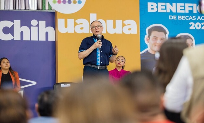 Ciudad de Chihuahua.– El alcalde Jorge Cruz Russek, encabezó la entrega simbólica de las Becas de Excelencia Académica y Formación edición 2024, con el fin de reconocer a quienes se distinguen por su alto desempeño escolar, para prevenir la deserción escolar e impulsar su competitividad.